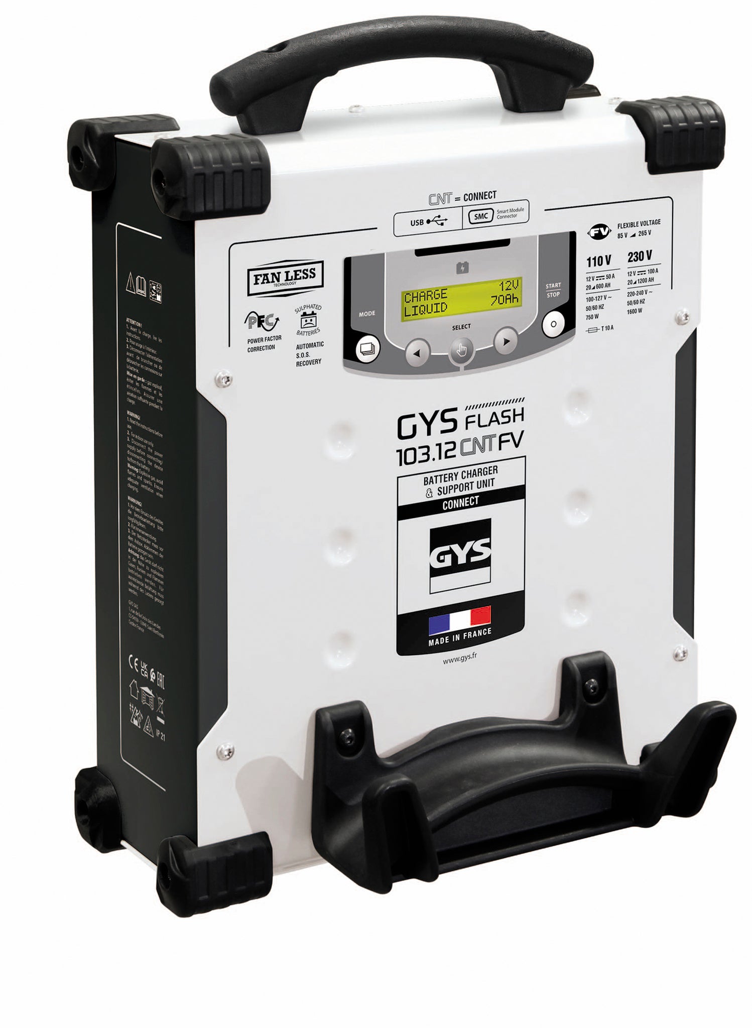 Specially designed for mounting on a wall or lift, the GYSFLASH vertical 103.12 CNT FV is a high-power 100 A CONNECTED charger with inverter technology. It keeps a 12 V lead-acid or lithium battery at a perfectly stabilised voltage during diagnostic phases. It also guarantees optimum charge quality for servicing the most advanced vehicles. Its USB connectivity makes it 100% customisable.